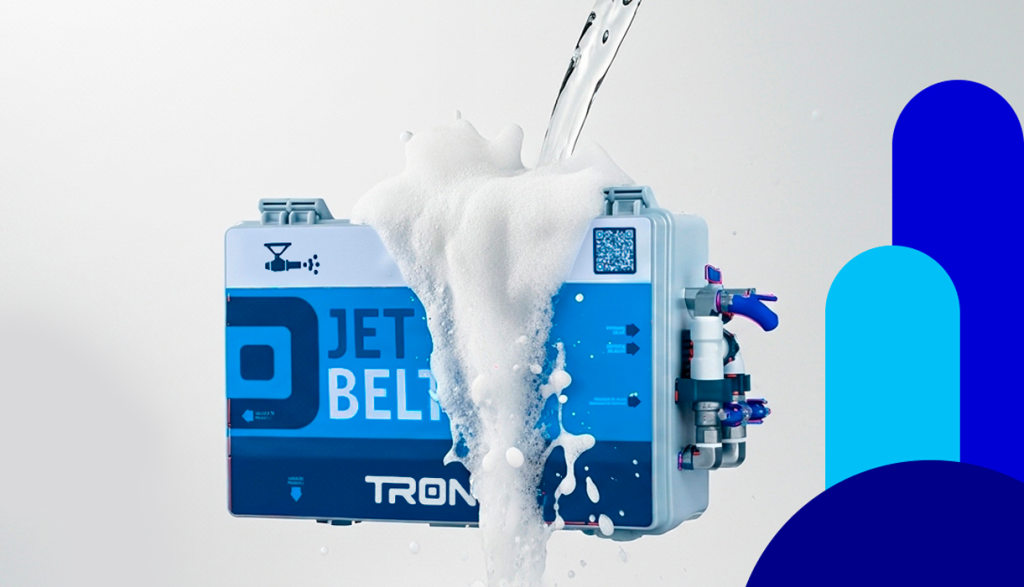 Apresentamos o JetBelt, um potente gerador de espuma e sistema para limpeza de esteiras móveis com enxágue, desenvolvido pela TRON para indústrias de alimentos e bebidas.